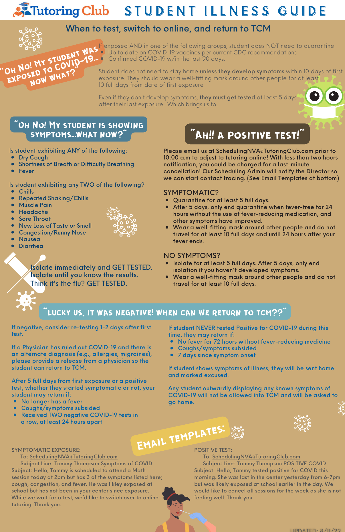 If your student is exhibiting any signs of illness, please respect our community and keep them home for the safety of others. Please send an email to SchedulingNVA@TutoringClub.com prior to 10:00 a.m. on the day of your student’s scheduled tutoring session so we can notify their tutor accordingly and give the spot to another student on the waitlist. Without advanced notification of your student's illness at least two hours prior to their session, the absence cannot be made up and your account will be charged for the missed time. For the health of others, if your child shows symptoms of illness, they will be sent home and the hour will be marked excused. Similarly, any student or employee outwardly displaying cough, shortness of breath, or other known symptoms of COVID-19 will not be allowed into TC and will be asked to go home.*
